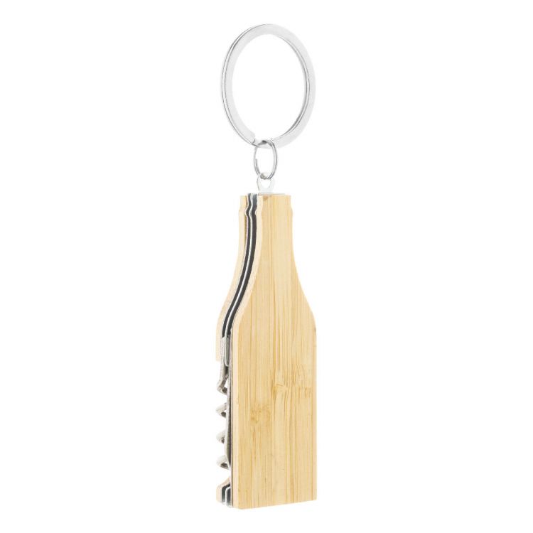 Flaschenförmiger Multifunktions-Schlüsselanhänger aus Edelstahl und Bambus. Mit 4 Funktionen: Messer, Korkenzieher, Flaschenöffner und Feile