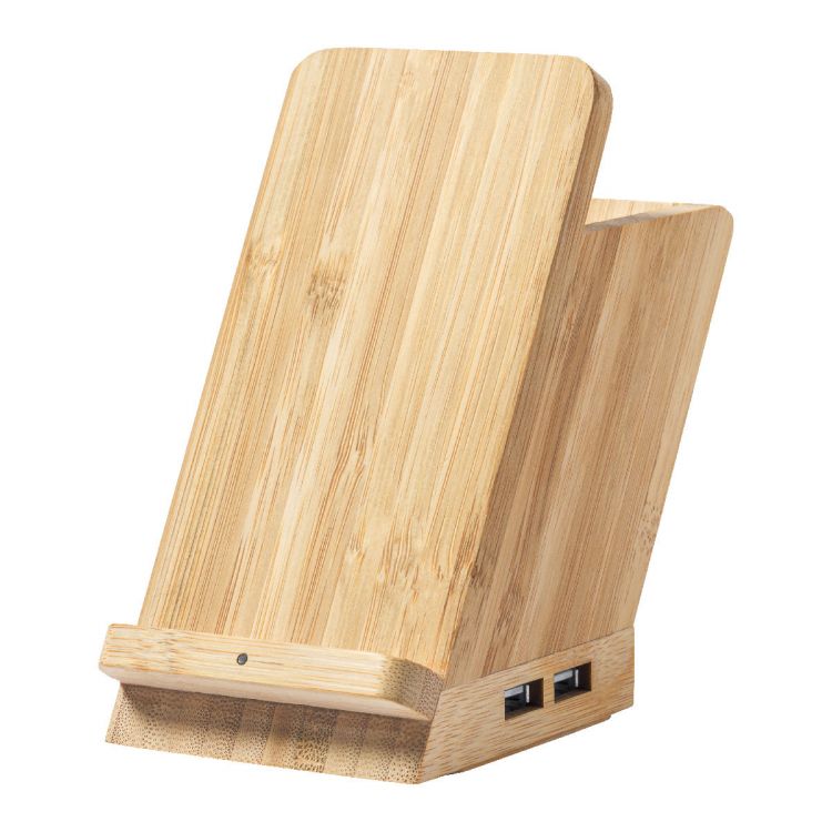 Multifunktionaler Stifteköcher aus Bambus mit Handyhalter, Wireless-Charger (5W) und 4 Port USB Hub (USB 2.0). Inkl. USB-Ladekabel