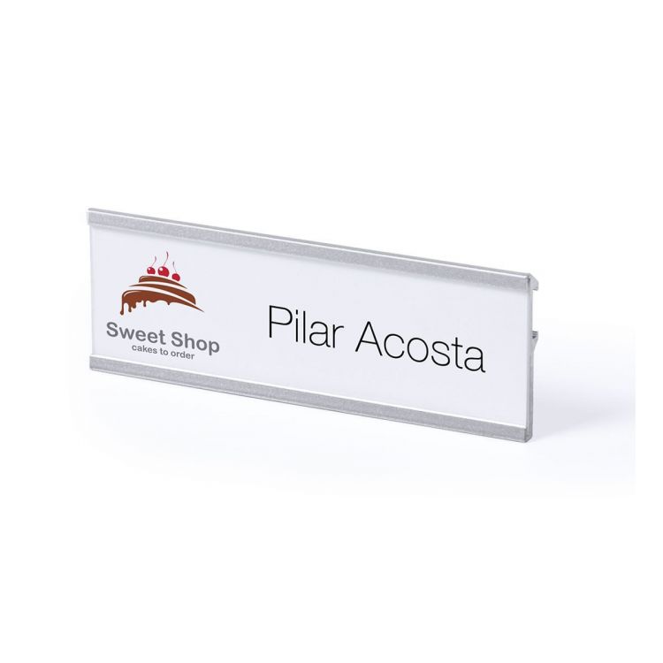 Ausweishalter mit Aluminiumrahmen in eloxierter Ausführung. Mit Sicherheitsnadel auf der Rückseite für sichere Befestigung. (silber farbe)