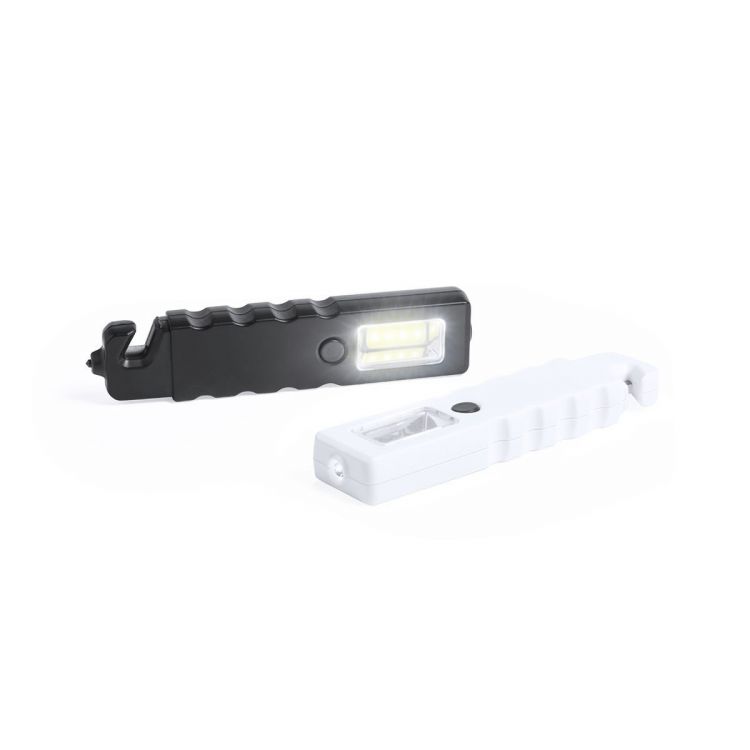 3-in-1 Notfallhammer mit LED-Taschenlampe mit 4 COB-LEDs und 3 Lichteinstellungen. Mit magnetischer Oberfläche und Gurtschneider.