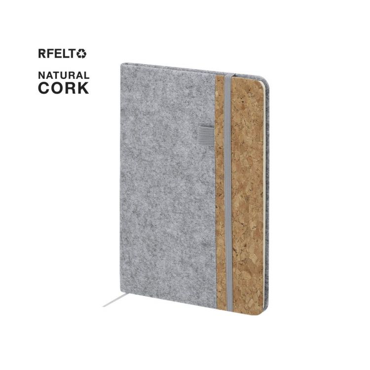 Notizblock mit stabilen Covern aus einer Kombination von RPET- und Korkfilz. Enthält 80 Blätter mit Linien und einen elastischen Halter für Stifte auf dem Cover, ein elastisches Band zum Schließen und ein passendes Lesezeichen. Enthält das Kennzeichen RFELT.Hergestellt aus pflanzlichen Materialien, um die Verwendung natürlicher Rohstoffe zu fördern und die Emissionen von Schadstoffen zu reduzieren.RPET-Filz entsteht durch die Kombination des Recyclingprozesses von Kunststoffmaterialien mit der jahrhundertealten Technik der Filzherstellung und ergibt ein eco-trend Material, das nicht nur recycelten Ursprungs ist, sondern auch recycelbar wird.