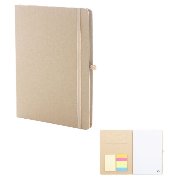 Notizbuch mit Umschlag aus recycelter Pappe und 70 Blankoseiten aus Recyclingpapier. Die Innenseite des Umschlags enthält 25 Haftnotizen, 125 Seitenmarker und ein Kartenfach. Mit Gummibandverschluss und Stifthalter. Format: A5, in natürlich farbe