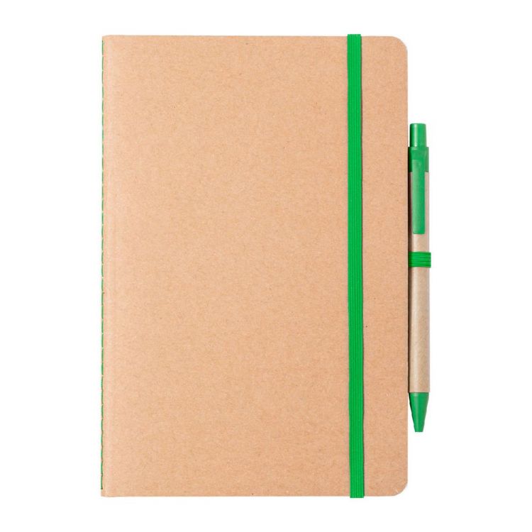 A5 Notizbuch mit Umschlag aus recycleter Pappe, 60 Seiten (blanko), farbigem Gummiband und Kugelschreiber aus Weizenstroh-Kunststoff (blauschreibend).
