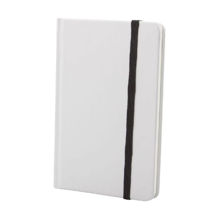 Notizbuch mit weißem Karton-Einband, 80 Seiten (blanko) und farbigem Gummiband. A6-Größe.