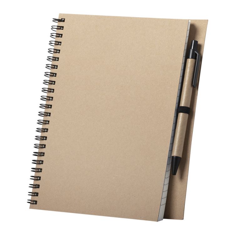 Spiral-Notizbuch aus recyceltem Karton. Inkl. Kugelschreiber aus Recyclingpapier, blauschreibend. 80 linierte Seiten, Größe A5