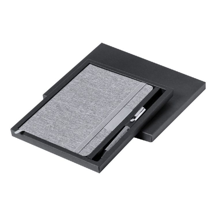Mit 300D RPET-Polyester überzogenes Notizbuch mit 100 linierten Blättern und Gummiband. Inklusive eines mit RPET-Polyester überzogenen Metallkugelschreibers, blauschreibend. Größe A5, in grau farbe