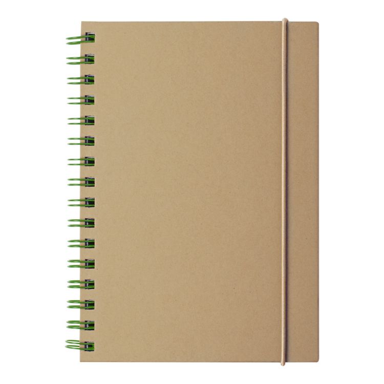 Spiral-Notizbuch aus recyceltem Karton mit Gummiband. 80 linierte Seiten, Größe A5.