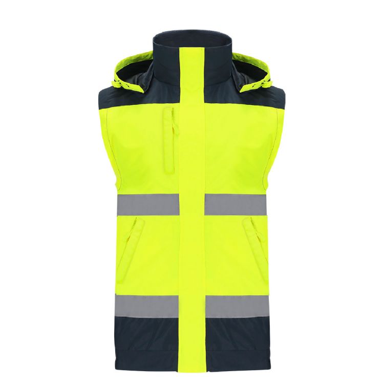 Hochsichtbare gepolsterte Jacke mit zweifarbigem Design. Sie besteht aus wasserdichtem Außenstoff und hitzeversiegelten Nähten und bietet Schutz vor Wind und Regen. Mit zwei horizontalen reflektierenden Streifen am Körper und zwei an den Ärmeln, die eine optimale Sicht bei schlechtem Licht gewährleisten.Beinhaltet eine aufrollbare Kapuze, einen Reißverschluss vorne und einen Klettverschluss sowie verstellbare Manschetten und elastische Taille für eine bessere Passform. Er hat zwei Seitentaschen mit Reißverschluss, eine Tasche auf der rechten Brust und eine Innentasche mit Reißverschluss.Er verfügt über einen Innenzugang hinten zur Aufbereitung oder Individualisierung.