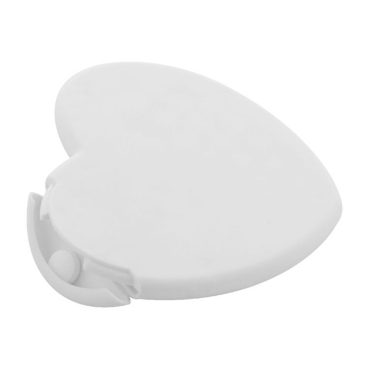 Herzförmiger Mintspender aus Kunststoff mit ca. 8 Gramm zuckerfreien Mentholbonbons.