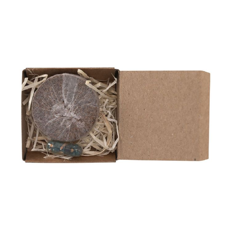 Pflanzbare Packung mit Saatgutkapsel und Substrattablette, präsentiert in einem recycelten Kartonbehälter mit Pflanzanweisungen. Wildblumen. (natürlich farbe)
