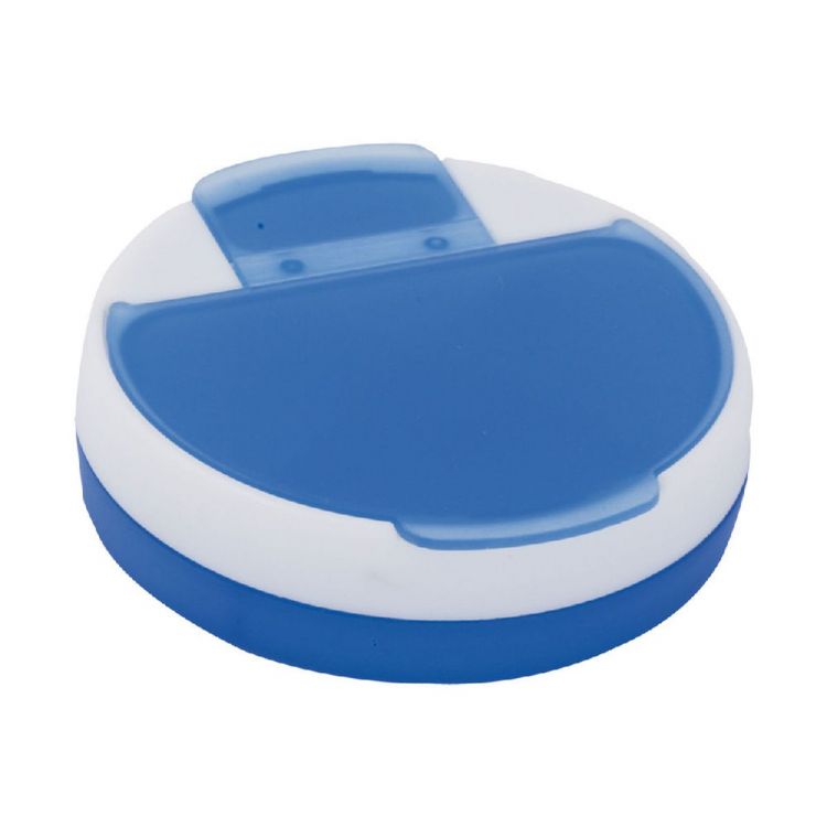 Runde Tablettendose mit 4 Fächern aus Kunststoff.