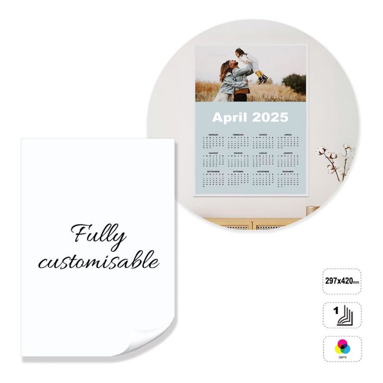 Vertikaler Jahresplaner, vollständig anpassbar. Das Produkt besteht aus matt gestrichenem 350-Gramm-Papier, das auf der Vorderseite im Vierfarbendruck bedruckt werden kann. Erhältlich mit Laminierung auf der Vorderseite, wahlweise glänzend, matt oder soft touch. Der Kalender kann individuell gestaltet werden, indem die voreingestellte Vorlage geändert wird, oder er kann komplett nach den Vorgaben einer neutralen Vorlage erstellt werden.