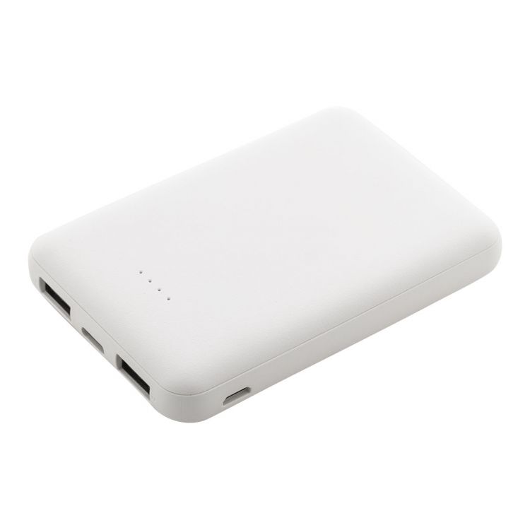 Powerbank aus recyceltem ABS mit 5000 mAh Akku. Mit zwei USB- und einem USB-C-Ladeanschluss. Micro-USB- und USB-C-Eingang. Inklusive USB-Ladekabel.