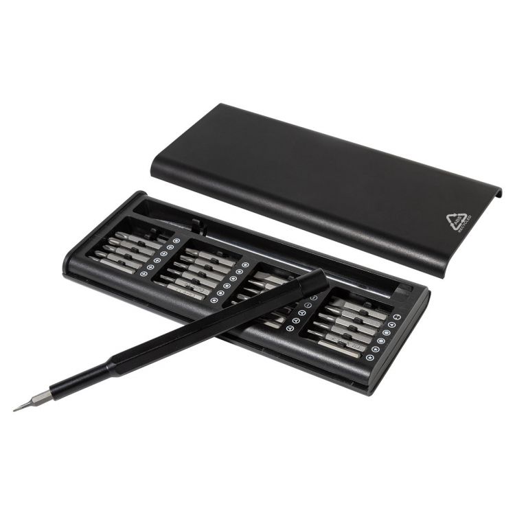Präzisionsschraubendreher-Set mit 24 Bits im recycelten ABS-Koffer. Der Griff verfügt über eine magnetische Bitaufnahme für schnellen und sicheren Bitwechsel.
