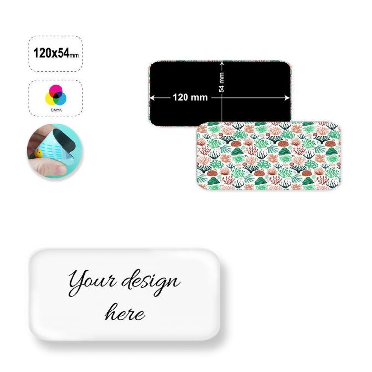 Rechteckiger, flexibler Magnet aus einer Magnetfolie, die auf eine kunststoffbeschichtete Papieroberfläche laminiert ist. Das Produkt ist auf der Vorderseite mit Digitaldruck vollständig personalisierbar.