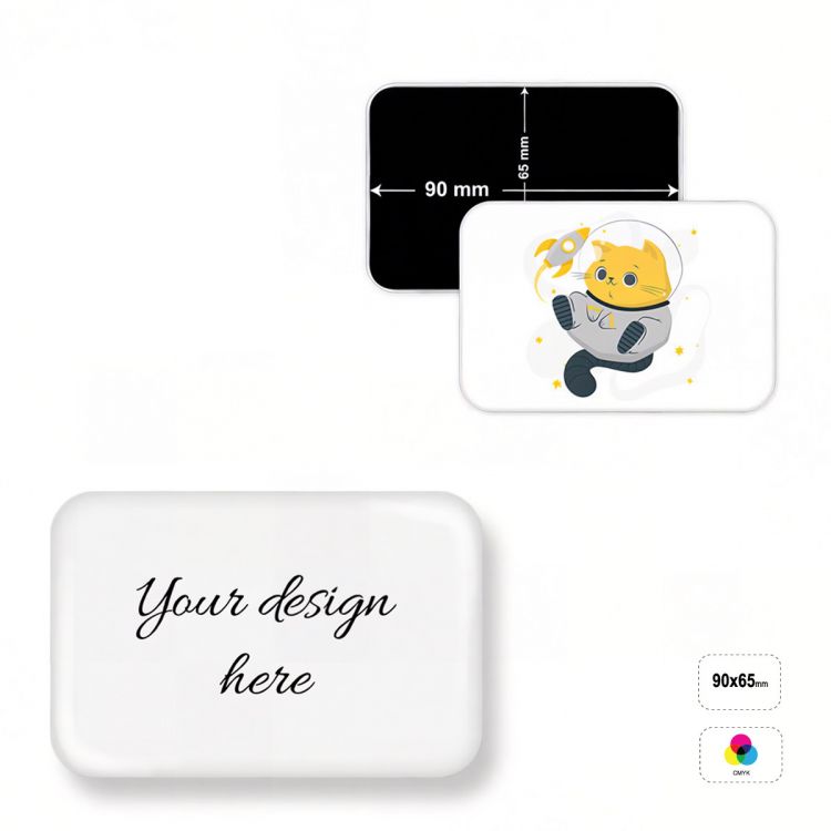 Rechteckiger Magnet, völlig individuell gestaltbar. Das STANDARD-Produkt besteht aus einer kunststoffbeschichteten Papiereinlage, die mit einem inneren Trägerblatt verbunden ist, das auf ein Magnetblatt laminiert ist. Optional sind verschiedene Ausführungen erhältlich, z. B. leuchtend, reflektierend, UV-Lackierung, Silber, Gold, Papier mit Canva-Effekt, Gürteltierhaut- Effekt, Eidechsenhaut- Effekt und Prägung.
