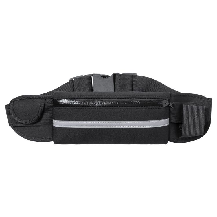 Gürteltasche aus Softshell mit einem Reißverschlussfach, einer kleinen Tasche, elastischem Flaschenhalter, reflektierendem Band und verstellbarem Gurt. Nur für Werbezwecke, das Produkt erfüllt nicht die Eigenschaften von persönlicher Schutzausrüstung, in schwarz farbe