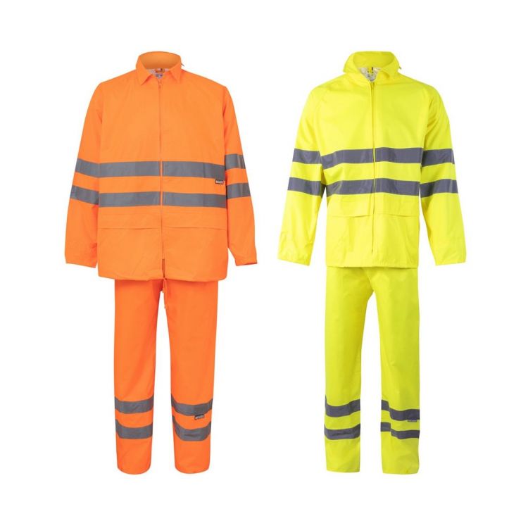 Regenanzug (130g/m²), aus Polyester (100%) mit PU-Beschichtung.Jacke mit zentralem Reißverschluss, Reflektorstreifen an Rumpf und Ärmeln und versteckter Kapuze im Kragen. Das innere Netzgewebe ist aus Polyester (100%) und die Metallösen fördern die Atmungsaktivität. Die Jacke ist mit einem Stopper verstellbar und hat 2 versteckte untere Taschen mit Klappe.Hose: elastischer Bund und Knopfverschluss. Mit Reflexstreifen an der Unterseite der Hose und seitlichen Öffnungen mit Klappe für den Zugang zu den Taschen. Mit verstellbaren Knöpfen an der Unterseite. Produkt gemäß EU-Verordnung 2016/425, zertifiziert nach EN20471 und Klasse Nº 3
