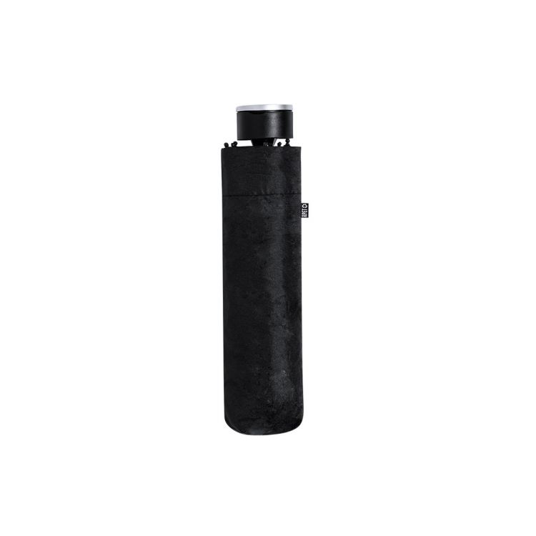 Faltbarer Regenschirm mit 98 cm Durchmesser. Aus 190T RPET Pongee-Material. Manuelle Öffnung, mit Anti-Wind-System und Fiberglas-Rippen. Ergonomischer Griff mit praktischem Metalltragegriff, passender Tragetasche und passendem Klettverschluss. Mit unverwechselbarem RPET-Etikett. Präsentiert in einer individuellen, recycelten Tasche.Das RPET-Material wird aus recyceltem Kunststoff hergestellt, wodurch die Wiederverwendung von Kunststoffabfällen gefördert und ein Beitrag zur Nachhaltigkeit auf unserem Planeten geleistet wird. (schwarz farbe)