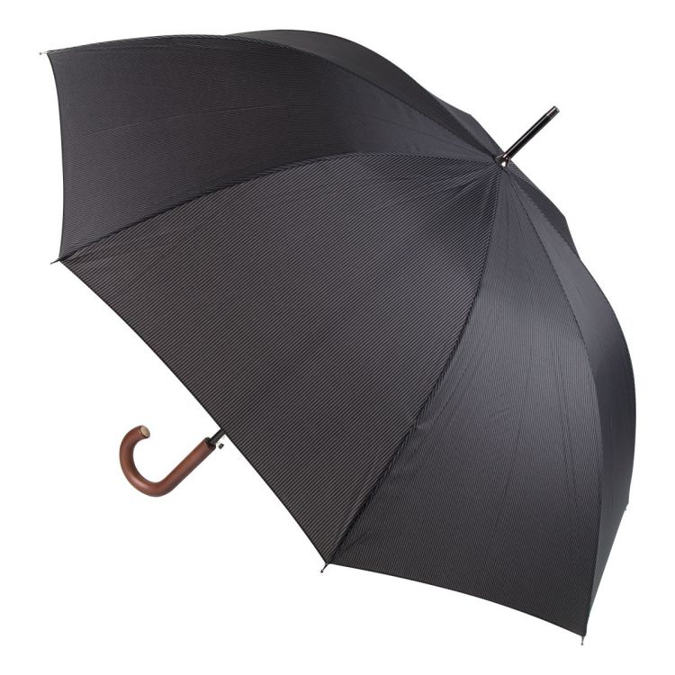Automatischer Windproof-Stockschirm mit 8 Segmenten, Bespannung in Nadelstreifen (schwarz/grau), Holzgriff, Metallrahmen und Fiberglasspeichen. Material: 190T Pongee. Marke: André Philippe, in schwarz farbe