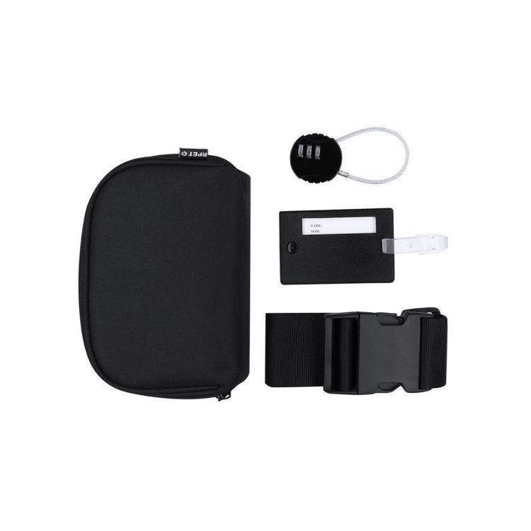 Reiseset. Enthält: verstellbares Band für Koffer, Gepäckanhänger und Zahlenschloss mit 3-stelligem Code und einem Stahlkabelverschluss. Präsentiert in einem RPET-Etui mit Reißverschluss und zwei Innentaschen. Enthält das RPET-Logo.Das RPET-Material wird aus recyceltem Kunststoff hergestellt, um die Wiederverwendung von Kunststoffabfällen zu fördern und zur Nachhaltigkeit des Planeten beizutragen. (schwarz farbe)