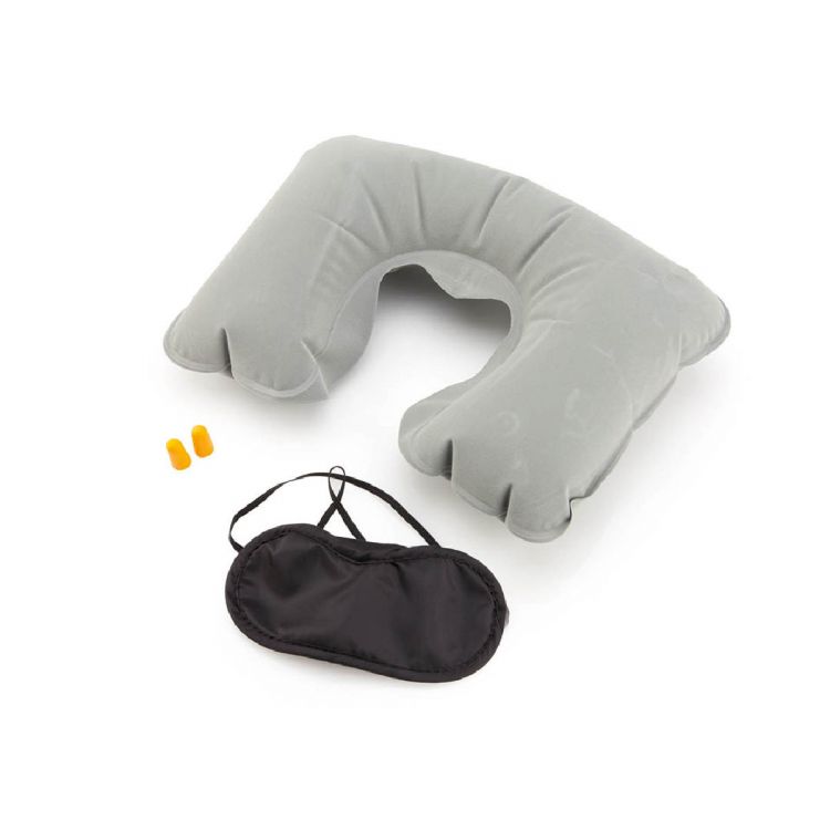 3-teiliges Reise-Set in weichem Wildleder-Etui in leuchtenden Farben. Enthält eine weiche und bequeme Mikrofaser-Maske in Schwarz mit farblich passendem Doppel-Gummiband für einen komfortablen Sitz, ein aufblasbares Nackenkissen aus Wildleder sowie Ohrenstöpsel aus angenehmem EVA-Material in Orange.