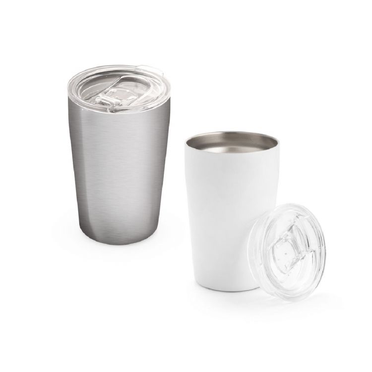 Reisebecher (380 mL) aus Edelstahl, doppelwandig und mit einem Schiebeverschlussdeckel. Geeignet für Sublimation. Geliefert in einer Schachtel