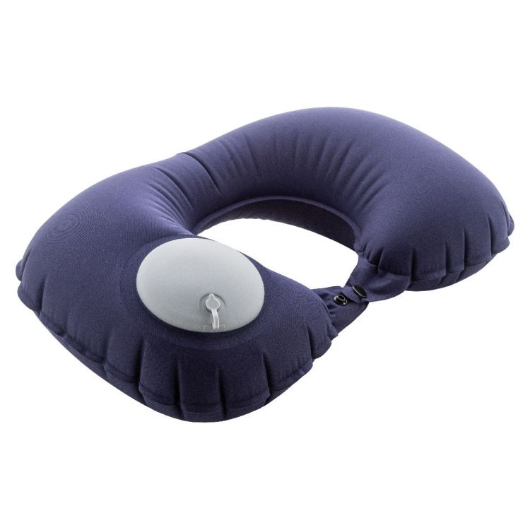 Aufblasbares Reisekissen aus RPET-Polyester mit integrierter Pumpe zum einfachen Aufblasen und Entleeren. In passender Stofftasche mit Kordelzug. Mit RPET-Label.