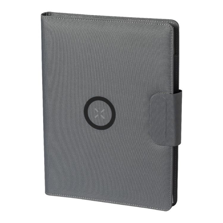 Dokumentenmappe im A4-Format aus 300D-RPET-Polyester mit integriertem Wireless-Fast-Charger (10 W), 5000-mAh-Powerbank mit USB-Ladeanschluss, faltbarem Handyhalter und Notizblock mit 20 linierten Blättern. Inklusive selbstklebendem Metallring zur Nutzung der Magnetfunktion an jedem kabellos aufladbaren Gerät. Inkl. USB-Ladekabel, in grau farbe