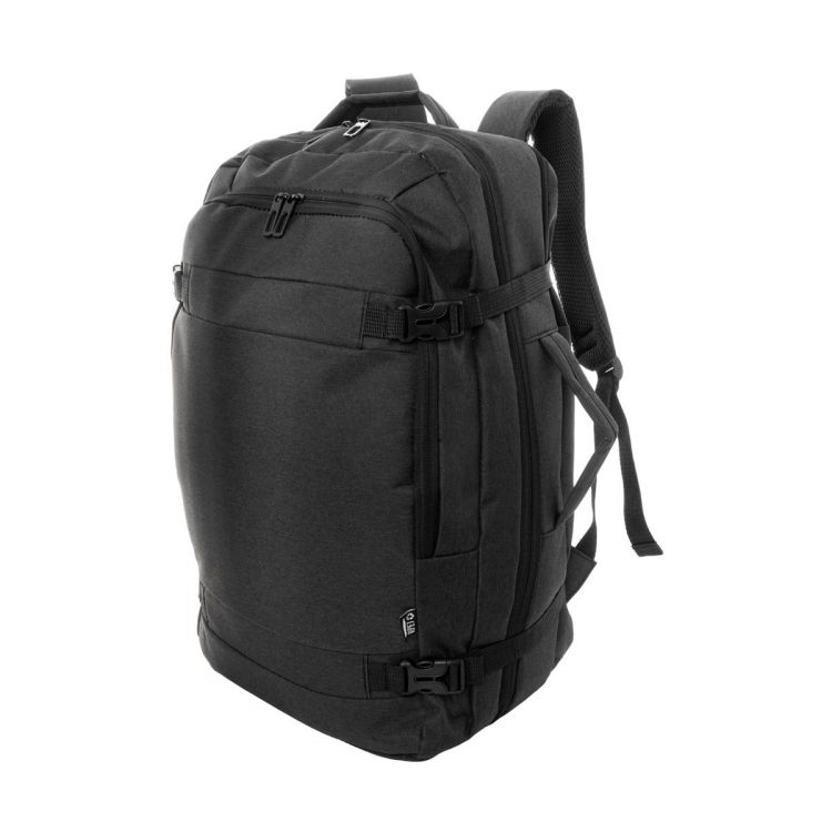 RPET-Rucksack mit Doppelfunktion und Dokumententasche mit 2 Reißverschlussfächern, Reißverschluss-Vortasche und gepolstertem Laptopfach (15"). Mit Anti-Diebstahl-Tasche, Trolley-Gurt, gepolstertem Rücken und Schultergurten. Material: 600D RPET-Polyester. Mit RPET-Label.