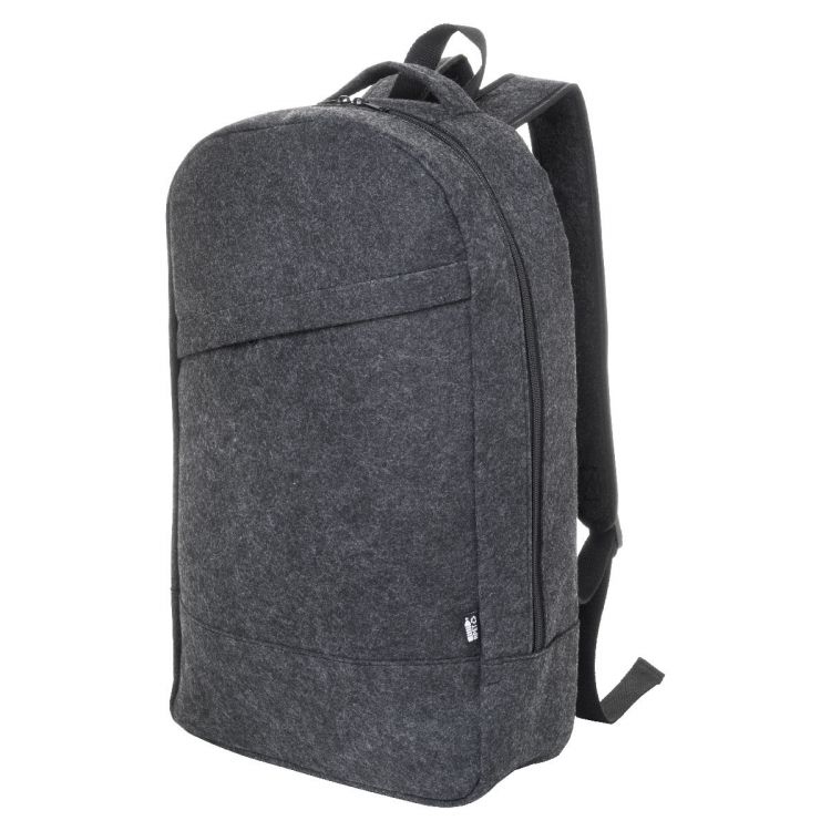 Rucksack aus RPET Filz mit Reißverschluss-Hauptfach, Fronttasche, Laptopfach (15"), Trolley-Befestigungsband und geposterten Schultergurten. Mit RPET-Label.