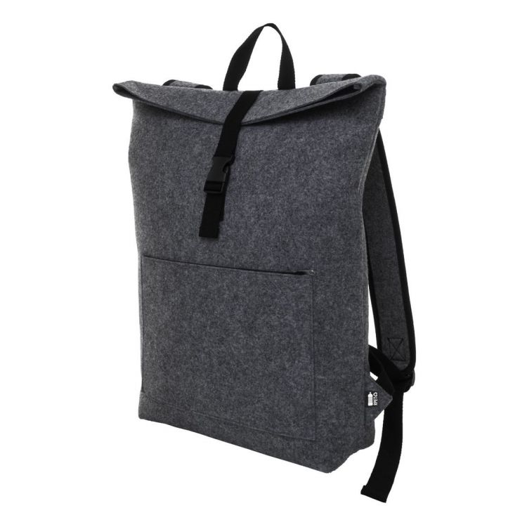 Rolltop-Rucksack aus RPET Filz mit Schnallenverschluss am Hauptfach, Reißverschluss-Fronttasche, Laptopfach (15") und gepolsterten Schultergurten. Mit RPET-Label.
