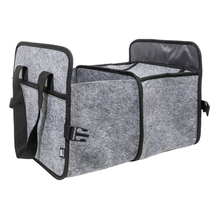 Faltbarer Kofferraumorganizer aus RPET-Filz mit Reißverschluss-Fronttasche, langen Griffen und seitlichen Schnallen für bequeme Aufbewahrung. Mit einem offenen Staufach und einem Kühlfach mit Reißverschluss und Aluminiumisolierung. Mit RPET-Label, in grau farbe