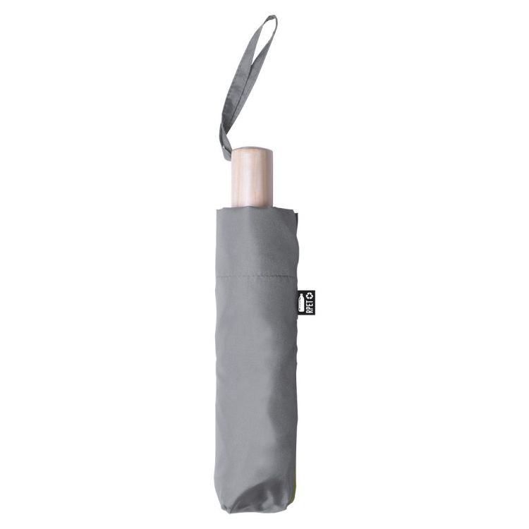 Manueller Taschenschirm mit 8 Segmenten und farblich abgestimmtem Etui. Material: Bespannung aus RPET, Metallrahmen, Fiberglas-Speichen und Griff aus Holz. Mit RPET-Label.