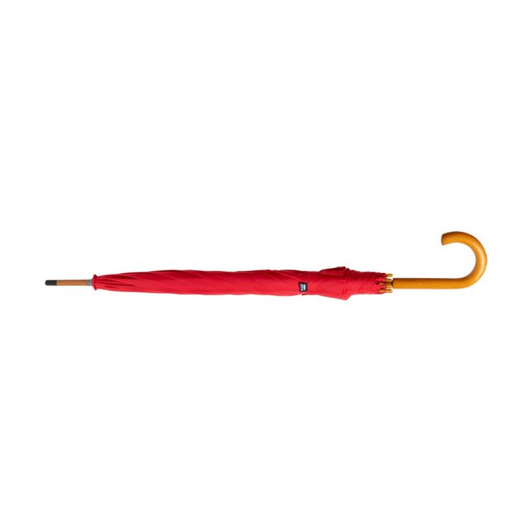 Automatik-Stockschirm mit 8 Segmenten, Bespannung aus RPET, Metallrahmen, Holzstock und -griff. Mit RPET-Label.