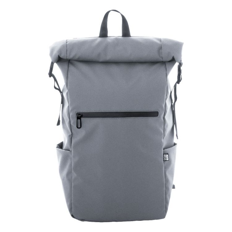 Wasserdichter Rolltop-Rucksack aus RPET mit Schnalle und Klettverschluss, gepolstertem Laptop- (16") und Tabletfach (10"), Reißverschlusstasche vorne, Seitentaschen, gepolstertem Rücken und Schultergurten. Material: PU beschichtetes 600D RPET-Polyester. Mit RPET-Label.