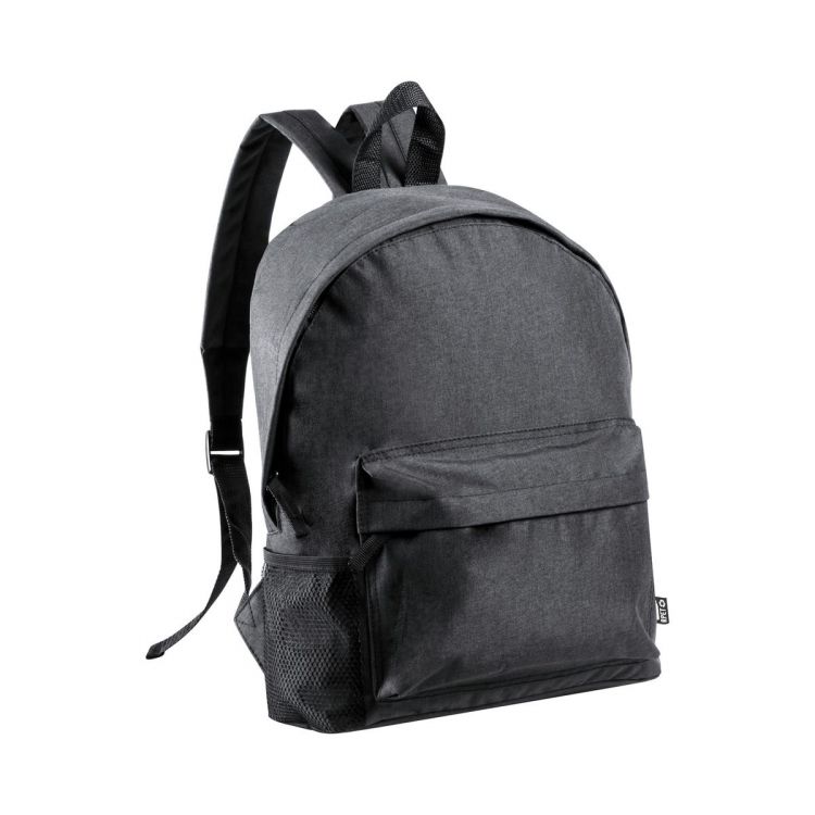 Rucksack mit Reißverschluss-Vordertasche, Netz-Seitentaschen, gepolstertem Rücken und Schultergurten. Material: 600D RPET-Polyester. Mit RPET-Label.