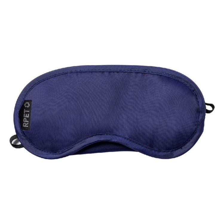 Schlafbrille aus RPET-Polyester mit Gummibändern, einzeln verpackt im RPET-Beutel mit Kordelzug. Mit RPET-Label.