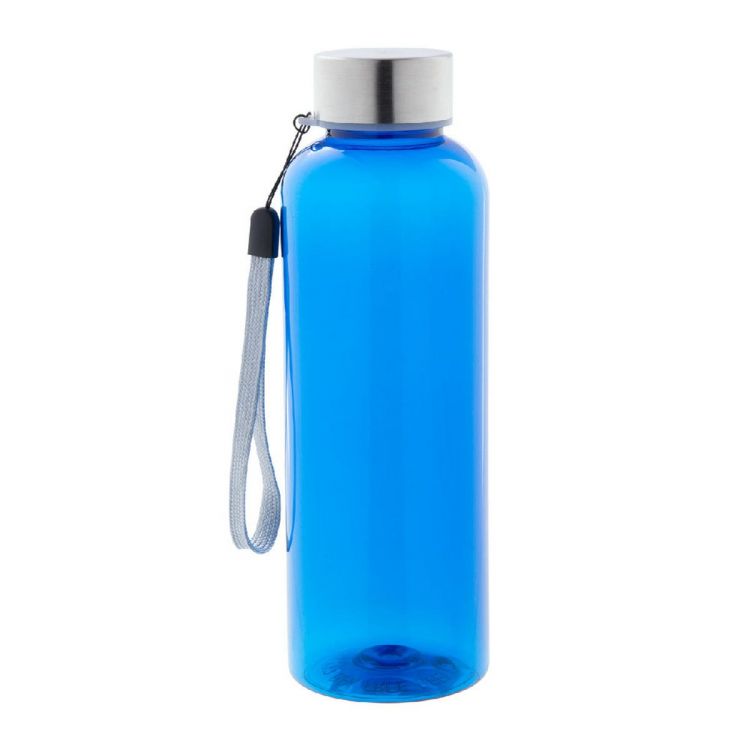 Trinkflasche aus RPET-Kunststoff (BPA-frei) mit Edelstahldeckel und Trageschlaufe. Füllmenge: 500 ml. Nicht geeignet für kohlensäurehaltige Getränke.