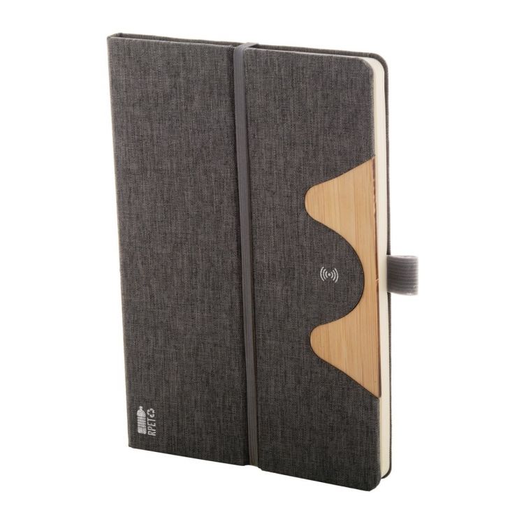 A5 Notizbuch mit Cover aus RPET Polyester mit Bambuseinsatz, Handyhalterfunktion, eingebautem Wireless-Fastcharger (15W) und 80 linierten Seiten aus RecyclingPapier. Inkl. USB-Ladekabel.