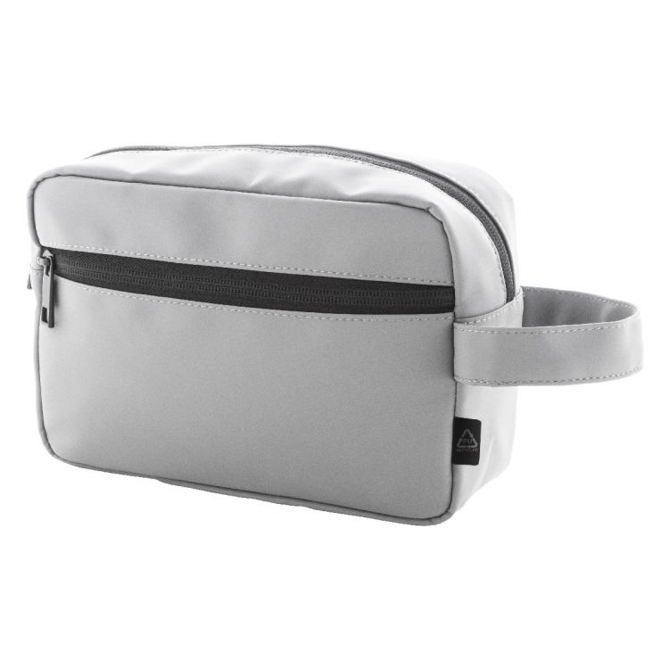 Weiche Kosmetiktasche aus recyceltem Kunstleder mit zwei Reißverschlußfächern, Tragegriff. Mit Label recyceltes Kunstleder.