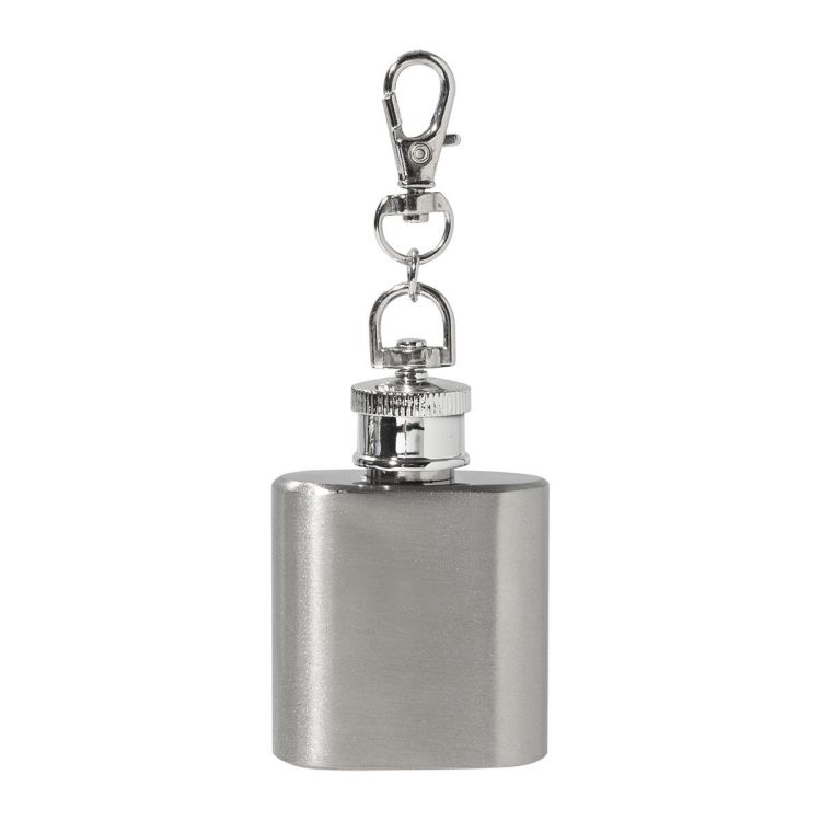 Mini-Flachmann aus recyceltem Edelstahl mit Karabiner-Schlüsselanhänger. Füllmenge: 30 ml