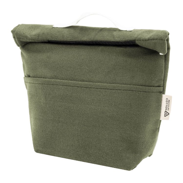 Rolltop-Kühltasche aus recyceltem Canvas mit Fronttasche, Aluminiumpolsterung und Klettverschluss. Material: 70 % recycelte Baumwolle und 30 % RPET-Polyester. Mit Label recycelte Baumwolle.