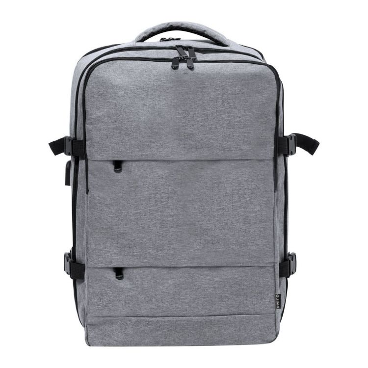 Wasserabweisender RPET-Rucksack mit 3 Hauptfächern mit Reißverschluss, 2 Fronttaschen mit Reißverschluss, Seitentasche mit Reißverschluss und versteckter Diebstahlschutztasche. Mit gepolstertem Laptop- (17") und Schuhfach, gepolstertem Rücken und Schultergurten. Mit Trolley-Gurt und integriertem USB-Anschluss für Powerbanks. 300D RPET-Polyester mit markantem RPET-Label.