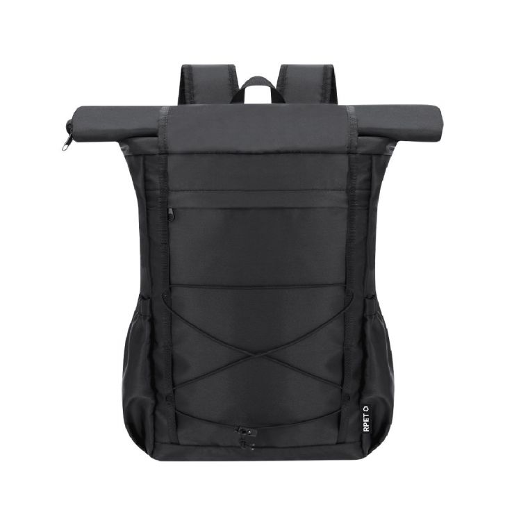 Rucksack aus 290D RPET-Polyester mit aufrollbarem Reißverschluss und zweitem Klettverschluss. Es hat eine Vordertasche mit einem unsichtbaren Reißverschluss sowie ein verstellbares Gummiband vorne. Zwei zusätzliche Seitentaschen. Großer Innenraum mit gepolstertem Fach für Laptops bis zu 15 Zoll. Gepolsterte Schulter- und Rückenriemen für zusätzlichen Komfort. RPET-Logo auf dem äußeren Etikett. (schwarz farbe)