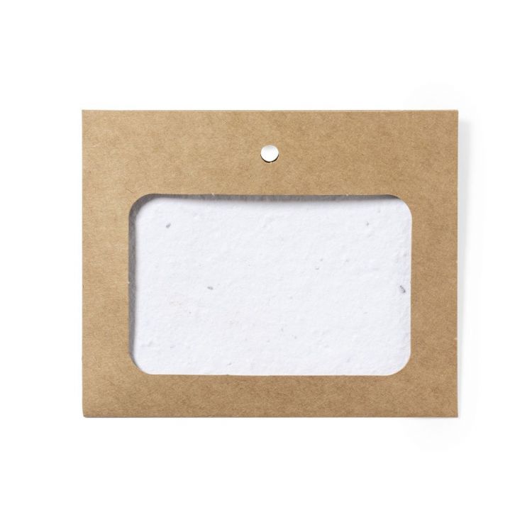Recyceltes Kraftpapier Namensschild. Inklusive einer Karte mit Wildblumensamen, die am Ende ihrer Lebensdauer in Pflanzpapier umgewandelt wird. Wildblumen in verschiedenen Farben, mit Pflanzanleitung im Inneren und Made in Europe-Emblem. (natürlich farbe)