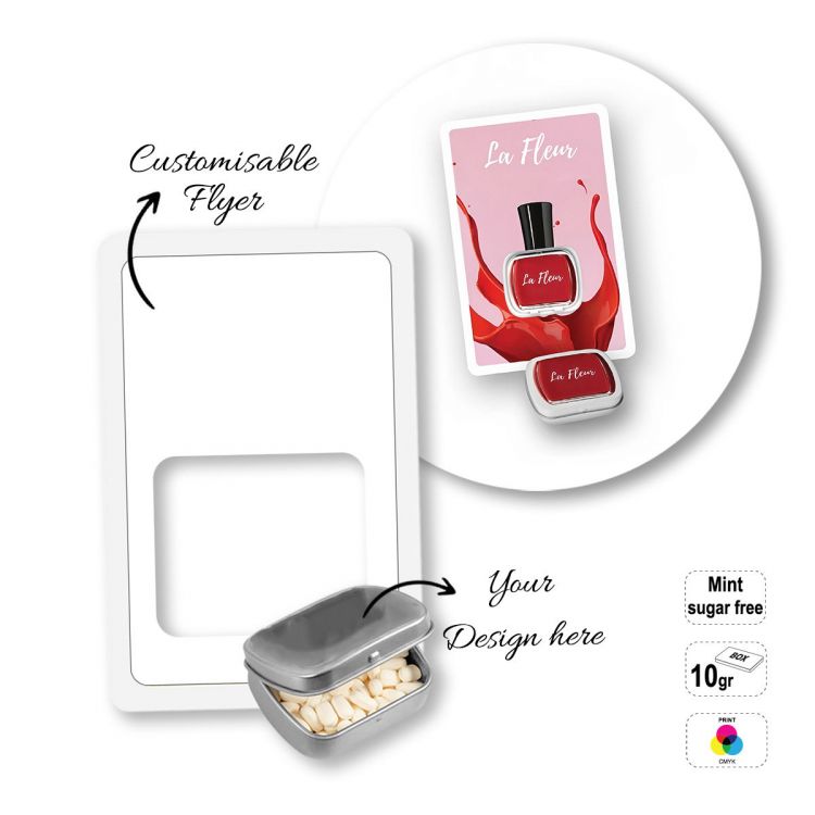 Rechteckige Schachtel mit zuckerfreien Pfefferminzbonbons (10 g) in einem rechteckigen Faltblatt aus Karton. Die Buchstaben des Produktcodes entsprechen der Größe und Form der Schachtel: A- 10 g rechteckige Schachtel, B- 20 g rechteckige Schachtel, C- 12 g runde Schachtel. Verpackung: wiederverwendbare Metallschachtel, vollständig individualisierbarer Papierflyer (Papierausführung: weiß oder Kraft, bei der Bestellung zu wählen), vorgeformte Schale aus rPET. Mindesthaltbarkeit: 12 Monate.
