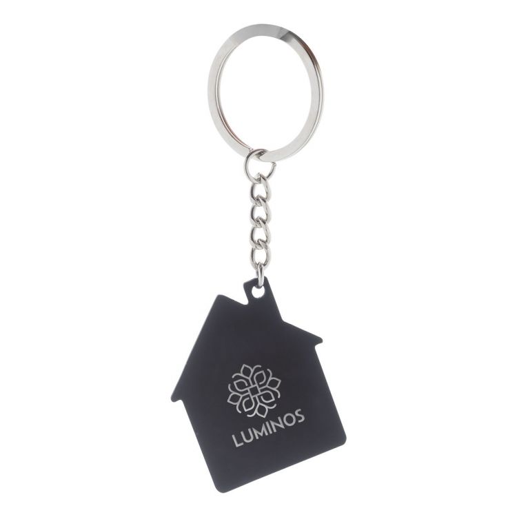 Schlüsselanhänger in Haus-Form aus recyceltem Edelstahl mit gummierter Oberfläche undspezieller Beschichtung für Spiegelgravuren, in schwarz farbe