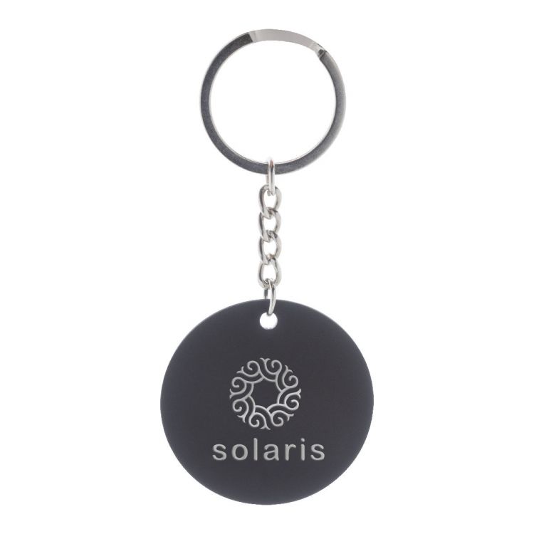 Runder Schlüsselanhänger aus recyceltem Edelstahl mit gummierter Oberfläche undspezieller Beschichtung für Spiegelgravuren, in schwarz farbe