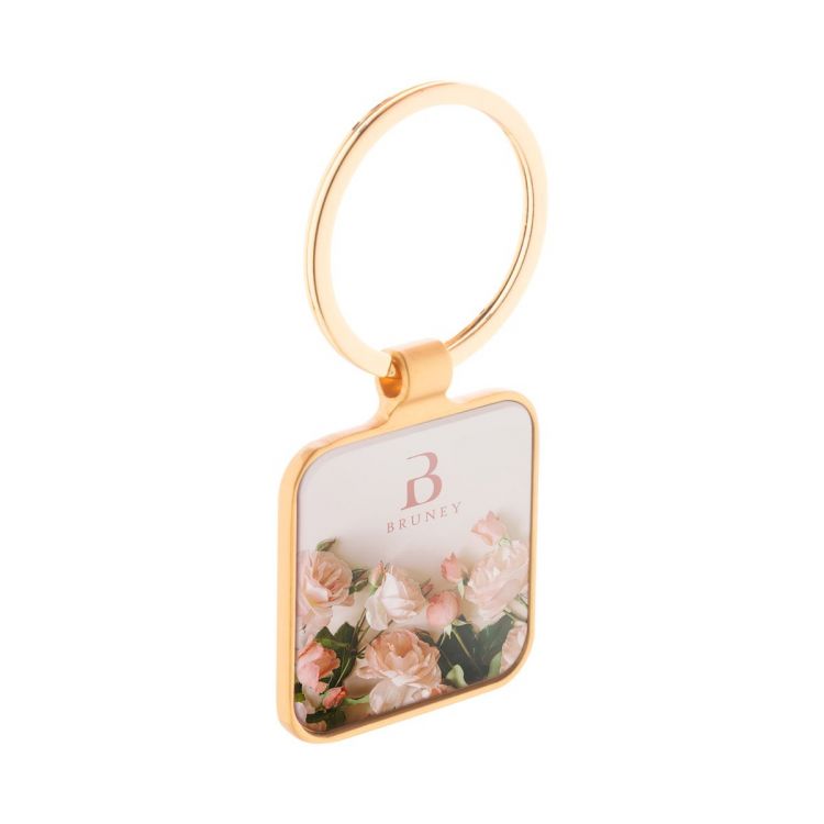 Quadratischer Metallschlüsselanhänger mit goldfarbener Oberfläche mit Gunmetal-Plättchen. Einzeln in Kraftpapierbox.